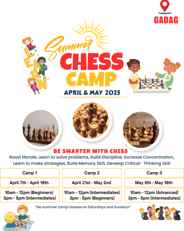 Unlock the power of strategic thinking with our exciting Summer Chess Camp at Gadag Chess Academy! Whether you're a beginner or an advanced player, our structured programs are designed to elevate your chess skills in a fun and engaging way.